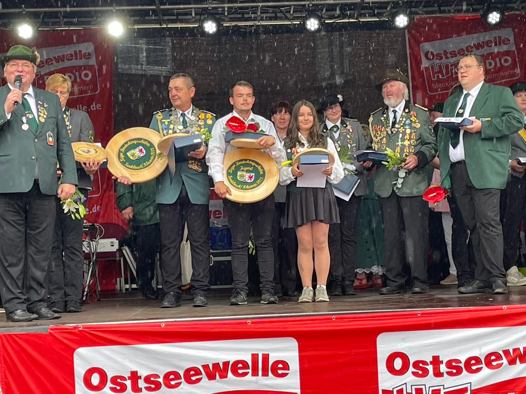 Das gab es wohl noch nie. Aber wer hatte sich nun von den vier Landesmajestäten zum Bundeskönigsschießen 2024 qualifiziert? Bei den Jugendlichen hatte unser Maurice Krolopp den besseren Teiler als Jette Braun aus Schwerin. Somit stand er schon als Kandidat fest. Bei den Erwachsenene hatte unser Dietmar Schimpfkäse den besseren Teiler als Veronika Zerbe und somit war klar, er fährt zum Bundeskönigsschießen 2024. Gratulation den Mäjestäten und natürlich unseren Lübstorfer Landeskönigen Dietmar Schimpfkäse und Maurice Krolopp. Ein starkes Ergebnis für unser Land und vor allem für unseren Verein. Wir wünschen beiden viel Kraft in der Vorbereitung zum Bundeskönigsschuss 2024 und natürlich viel Erfolg und